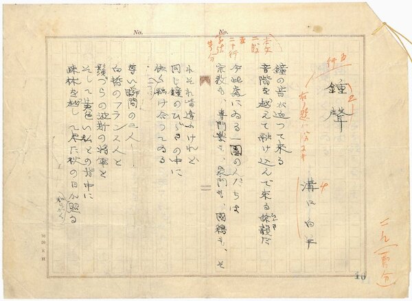 • 解説 『鍾声』 ペン書 400字詰原稿用紙2枚完 「鐘聲」「水たまり」の2篇。文末に「九・一〇・八」とある。(種別)近代詩 #八木書店近代自筆物/1.草稿類 #95号近代文学特輯 95001175 ※自筆物につきましては、毎月25日前後に新蒐品を追加しております。PDF形式で御覧になりたい方は https://company.books-yagi.co.jp/archives/news/10928 を参照ください。