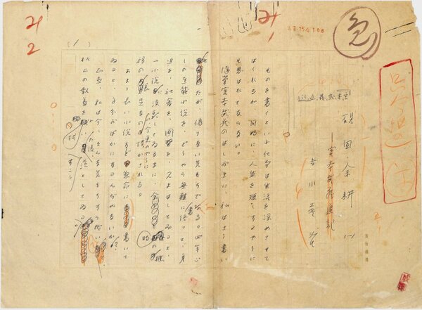 • 解説 『硯田余耕』宮本武蔵追記 ペン書 400字詰自家用箋27枚完 文選と植字の工程で裁断された原稿が、メンディングテープで貼り付けられている。(種別)随筆 #八木書店近代自筆物/1.草稿類 #95号近代文学特輯 95803278 ※自筆物につきましては、毎月25日前後に新蒐品を追加しております。PDF形式で御覧になりたい方は https://company.books-yagi.co.jp/archives/news/10928 を参照ください。