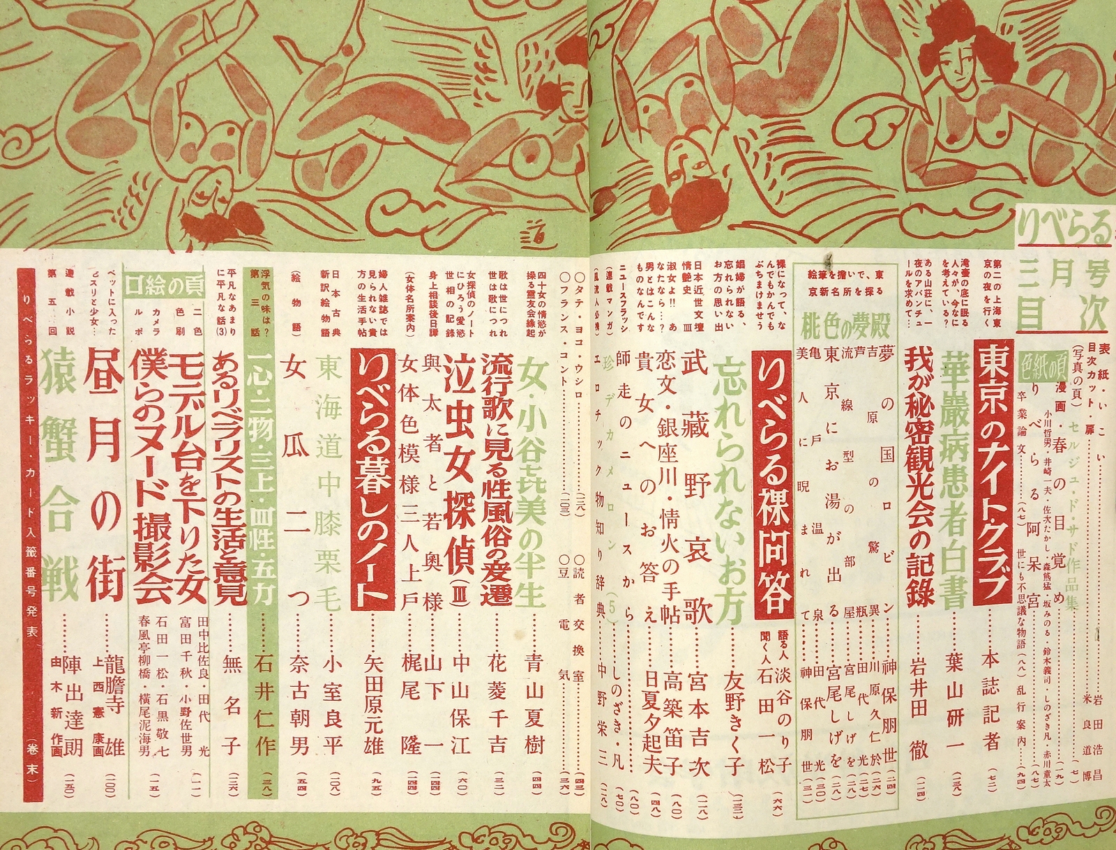 • 解説 淡谷のり子「りべらる裸問答」、岩井田徹「我が秘密観光会の記録」、花菱千吉「流行歌に見る性風俗の変遷」、龍膽寺雄「昼月の街」、他。