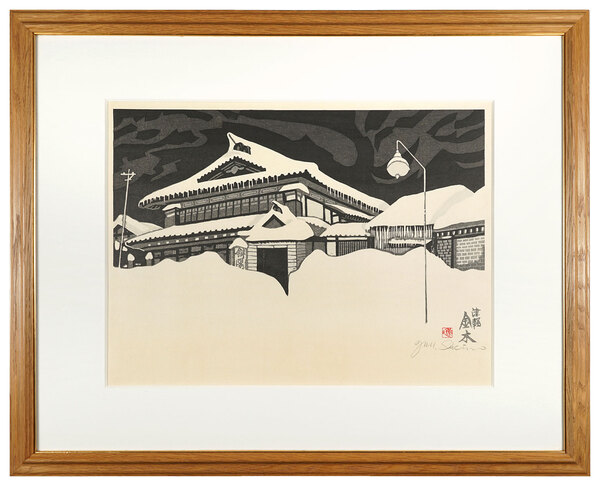 • 解説 木版 33x46cm(イメージサイズ) / 58x72cm(額サイズ)額装(箱欠)1面Frame 概ね良好 ※額裏密閉のため表面から確認できる範囲のみ  関野準一郎版画作品集(阿部出版)No.615 津軽三味線の発祥地