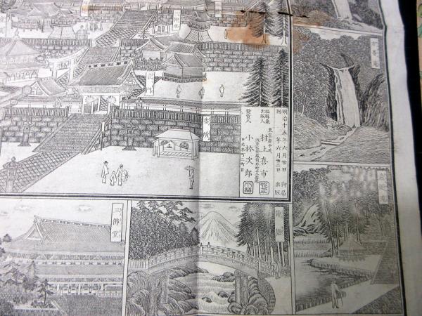 • 解説 明治15年(1882)古地図鳥瞰図「日光山名所全図」1点/村上喜市/銅版摺りです。