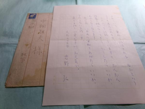 • 解説 吉野弘(よしの ひろし、1926年- 2014年)の肉筆。ペン書き。満寿屋200字詰原稿用紙5枚、封筒付。中桐雅夫(なかぎり まさお、1919年- 1983年)宛。