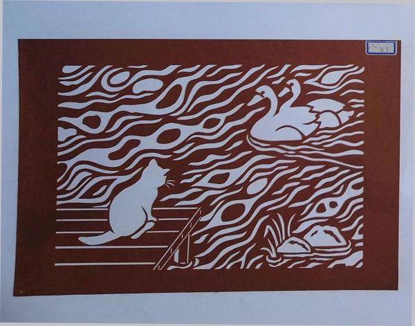 • 解説 D26020031〇伊勢型紙 手彫り 猫とアヒル アート 伝統和紙工芸 貼り絵 切り絵 昭和レトロ インテリア〇和本古書古文書