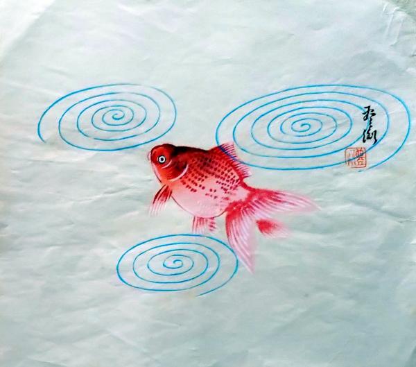 D26020525〇彩色木版画 団扇絵 うちわ絵 金魚 昭和年代〇和本古書古文書