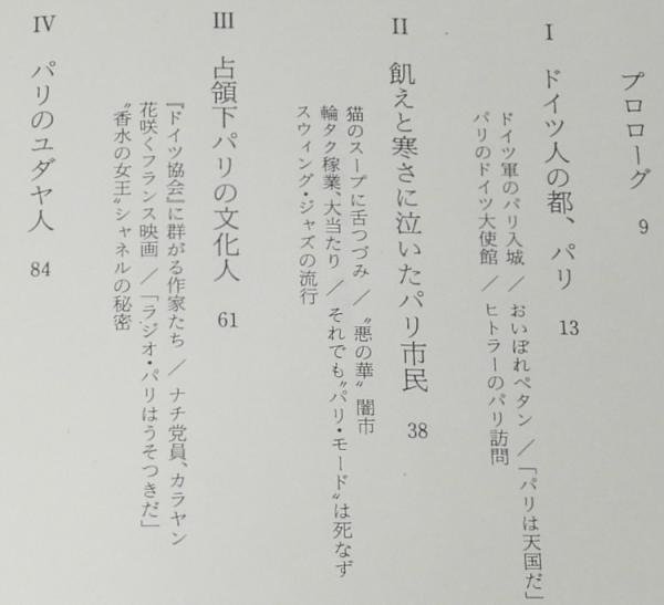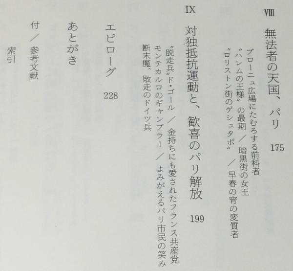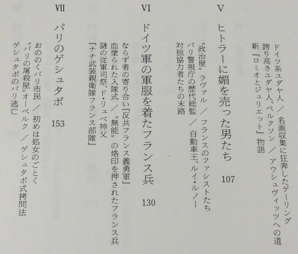 「占領下パリの文化人/パリのユダヤ人/ヒトラーに媚を売った男たち/ドイツ軍の軍服を着たフランス兵/パリのゲシュタポ/対独抵抗運動と歓喜のパリ解放/ほか」他233p.