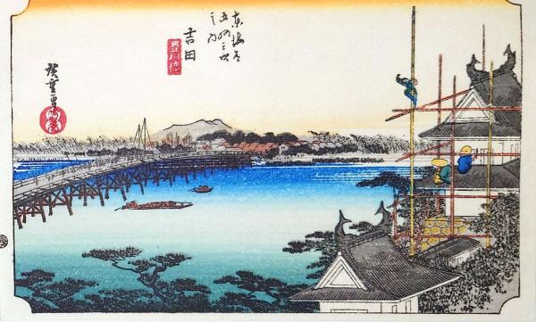 • 解説 D26020035〇彩色木版画 ハガキサイズ 東海道五十三次 吉田宿 保永堂版 広重 複刻昭和年代〇和本古書古文書