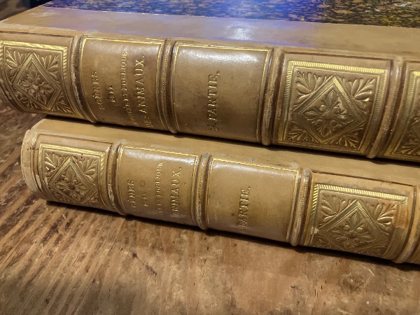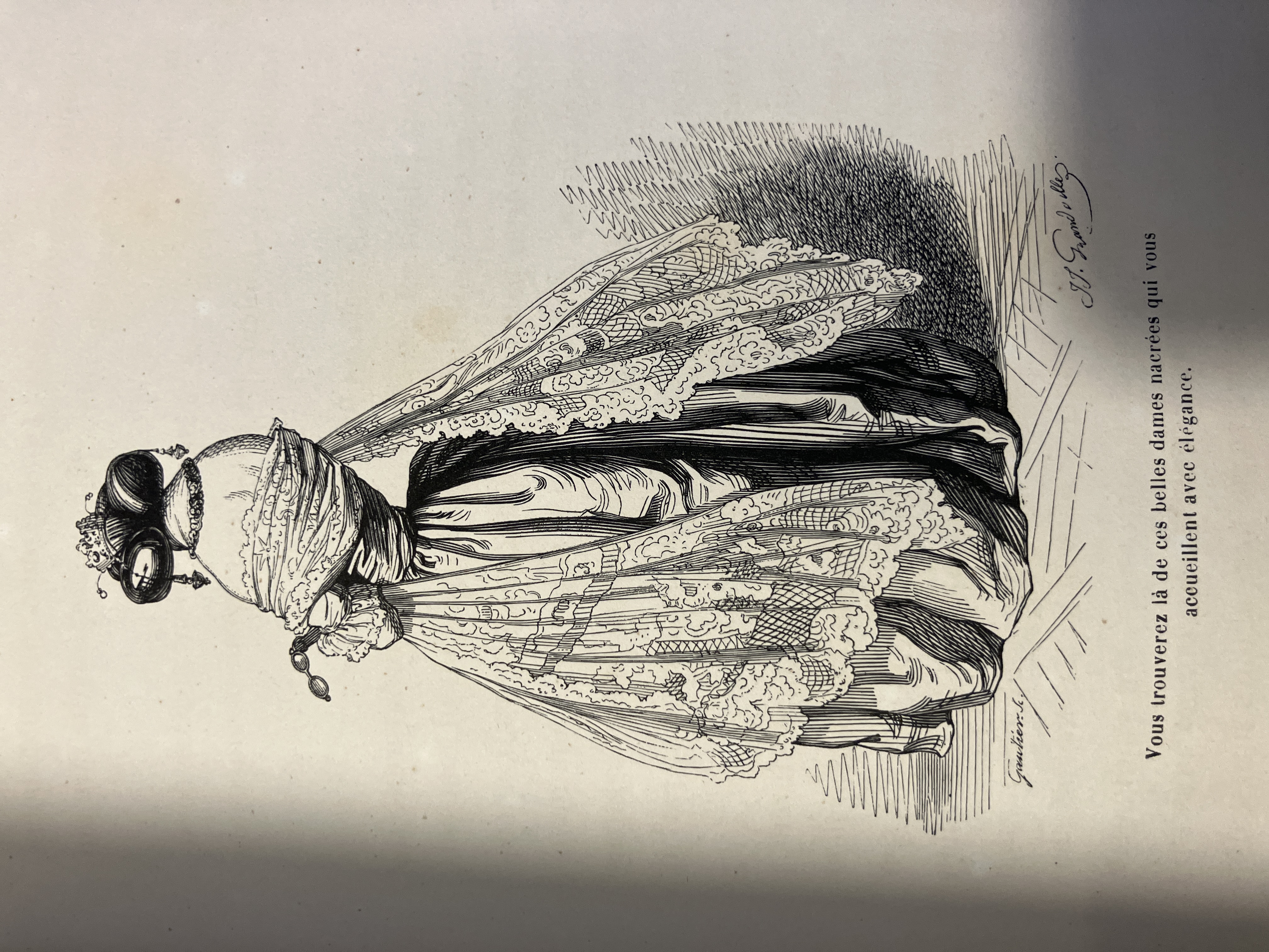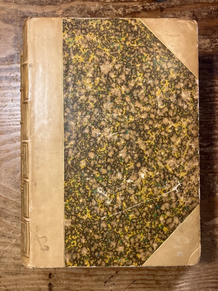 • 解説 背革コーネル平マーブル装、すれ少々、背バンドと背標題金押し飾り、天金、見返しマーブルに蔵書票貼り付きと2センチのやぶれ、薄くしみ、美本。挿絵は木口木版による。「19世紀挿絵本の最高傑作。...グランヴィル最大の「動物もの」で、登場人物たちは頭部が動物、体は人間という創造物たちである。この創造物たちに様々な社会階層の人々を演じさせる手法によって、鋭い社会風刺を繰り広げた。」『鹿島茂コレクション1 グランヴィル〜19世紀フランス幻想版画』求龍堂、2011年、96頁。