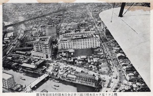 戦前絵葉書〇復興の大東京(航空写真)日本橋三越、三井正金、日本銀行、須田町方面 東京 古写真○和本古書古文書