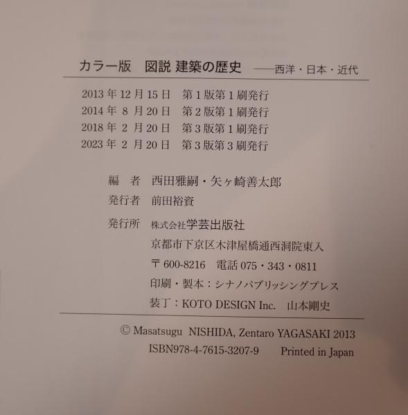 • 解説 西洋・日本・近代建築の歴史をカラー図版で解説した建築史の教科書 第3版第3刷、発行者: 前田裕資、印刷・製本: シナノパブリッシングプレス、装丁: KOTO DESIGN Inc. 山本剛史 表紙にわずかなスレはあるが、全体的にきれいな状態