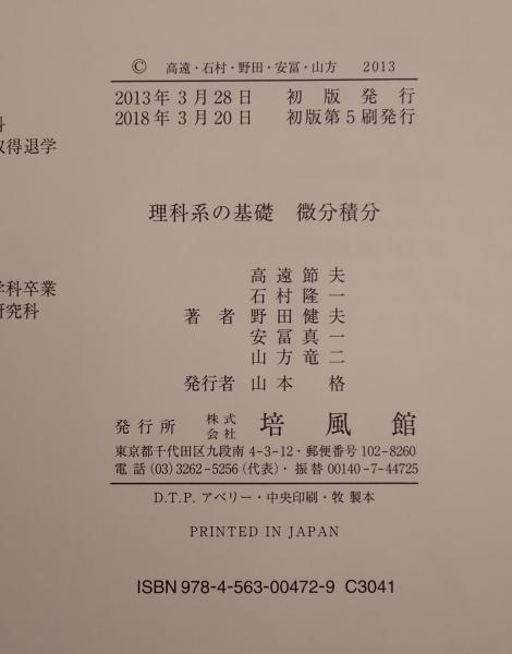 説明:微分積分は、高遠節夫・石村隆一・野田健夫共著の数学書で培風館から2018年に刊行されました。大学初学者向けに基本概念から応用例まで体系的に整理し、丁寧な解説と豊富な演習問題を提供しています。理工系学生にとって標準的テキストとして高い評価を受けています。