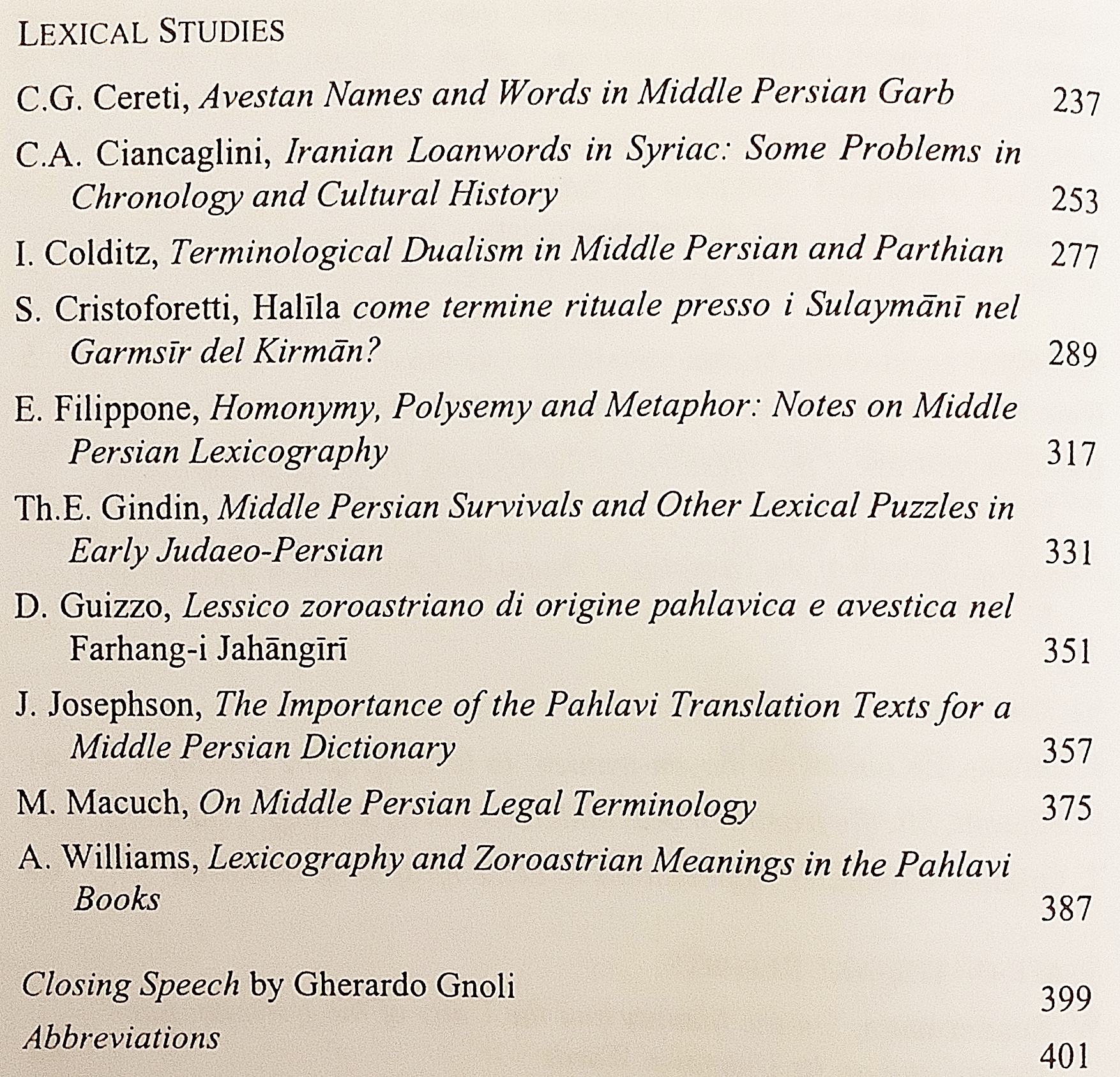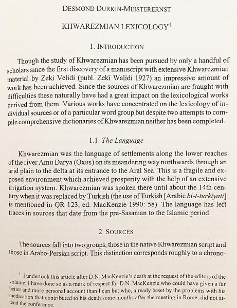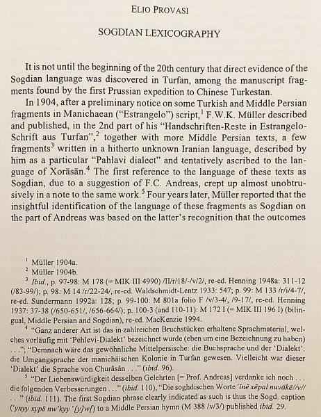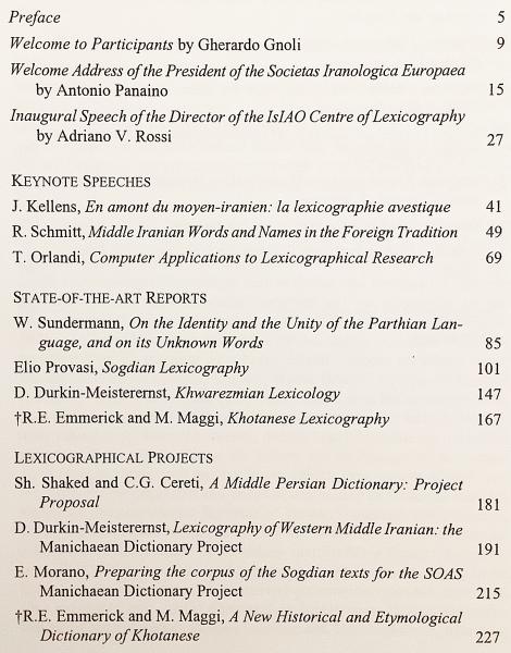 古代〜中期イラン語諸語 (中期ペルシア語 (パフラヴィー語)、パルティア語、ソグド語、ホレズム語、コータン語等) を対象に、語彙研究・辞書編纂の現状報告、方法論、進行中の辞書プロジェクトが収録。