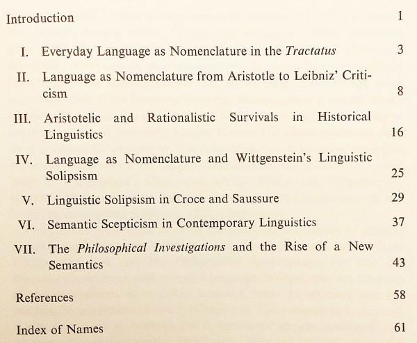 『論理哲学論考 (トラクトゥス)』における「命名理論」や言語=世界の写像説を起点に、アリストテレス以来の合理主義的言語観との連続と断絶を検討し、さらに『哲学探究』における方法論的転回が新たな意味論の地平を開いたことを論じる。