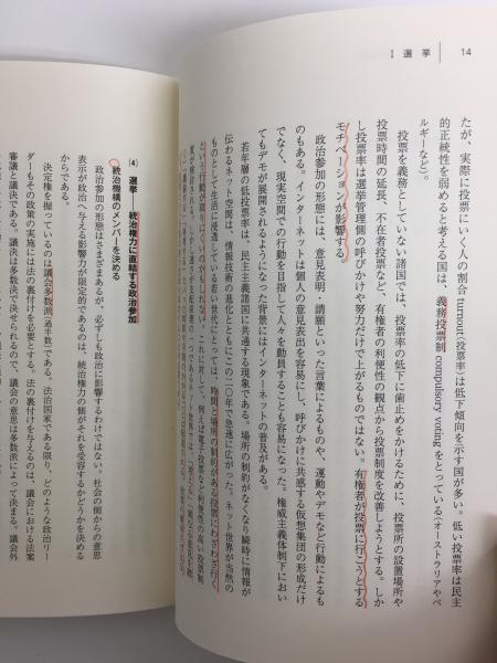 • 解説 2016/6/17第1刷発行。カバー・帯。本文内 (第1章 選挙制度内)赤鉛筆・青色鉛筆にて線引き・○印・波線記入あり、P.130角折れ(写真参照)他、経年良好。三方キズ、天イタミ