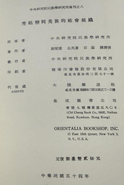 秀姑巒阿美族的社会組織 中央研究院民族学研究所専刊之8