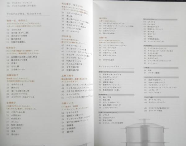 柳原一成 柳原尚之 松本忠子 後藤加寿子 金塚晴子 有元葉子 有元くるみ 河合真理 上野万梨子 谷島せい子 細川亜衣 加藤千恵 クリステル・クッキング クリステルの使い方の基本 クリステルで作る、私のおすすめ もっともっとクリステル! 煮る 炊く ゆでる 焼く 揚げる 蒸す オーブン フォンデュ お菓子