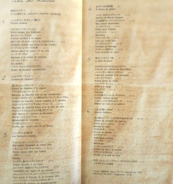 魅惑のデザート どんな場合にも、この6グループのデザートがあれば 1/ふんわり、やさしい喜び 2/ショコラにうっとり 3/シンプルな幸せ 4/おやつの時間 5/昔なつかしい味 6/こんな味いかが 紅茶、コーヒー、ハーブティー、何よりうれしいもの 心はずむチェック模様