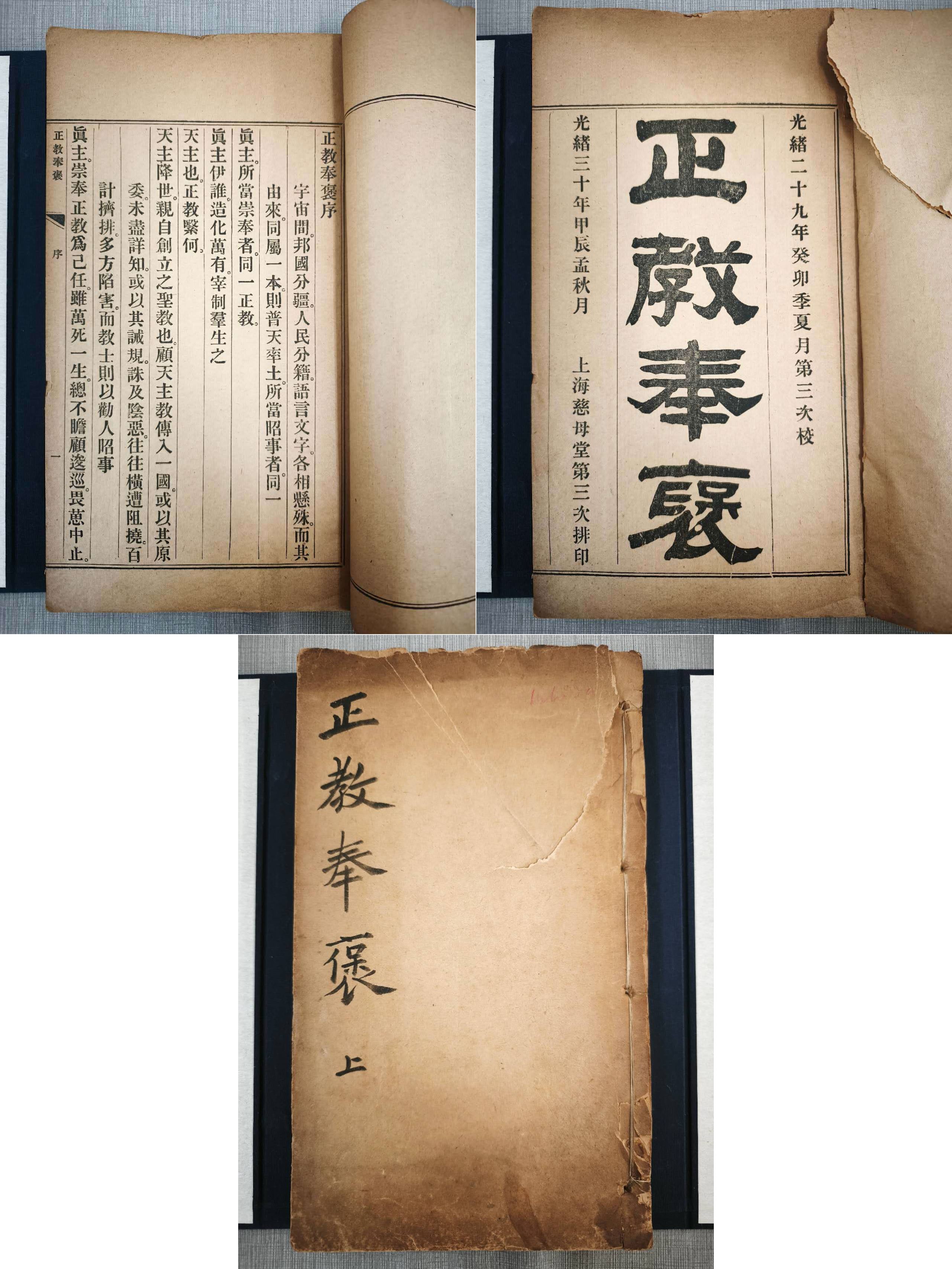• 解説 巻頭及び版心の書名: 正教奉褒、封面に「光緒二十九年癸卯季夏月第三次校」「光緒三十年甲辰孟秋月 上海慈母堂第三次排印」とあり、鉛活字排印本、帙付き、表紙ヤブレ、上巻のみ(七十一まで)。