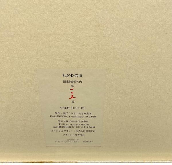 • 解説 オリジナルプリント集 限定300部 布装箱(表面ヤケシミ多し)付、輸送箱は欠 本体状態並 荒川紀一、石橋睦美、岩橋崇至、内田良平、尾白明夫、小森康行、近藤辰郎、白籏史朗、竹ヶ原陽一郎、水谷章人、三宅修、山下喜一郎、横山宏撮影のモノクロプリント13枚 昭和52年刊 発売:山と渓谷社 プリントサイズは31.5x44.5cm