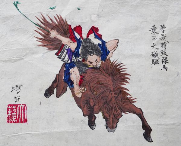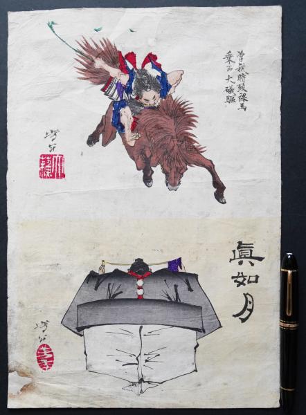 月岡芳年 木版画 芳年略画 1枚2図『曽我時致裸馬乗而大磯駆/ 真如月』