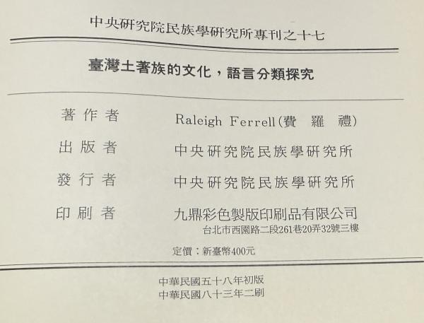 台湾土著族的文化 語言分類探究  中央研究院民族学研究所専刊之17