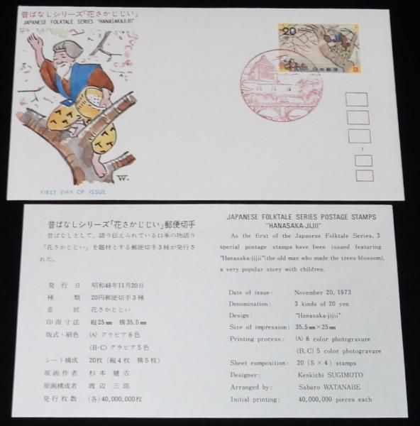 • 解説 【初日カバー】昔ばなしシリーズ 花さかじじい 全3種セット 全日本郵便切手普及協会 昭和48年