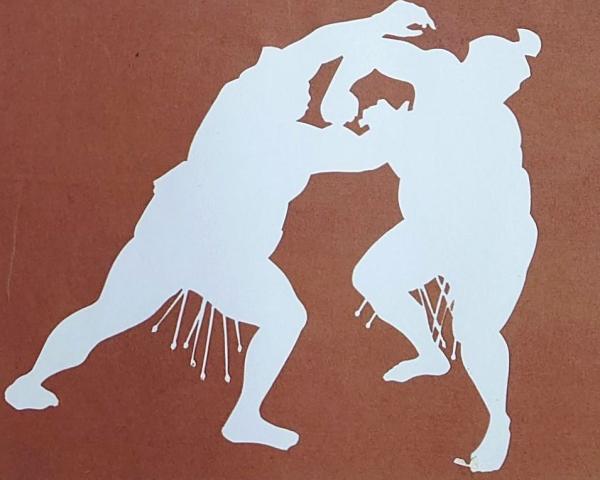 D26020085〇伊勢型紙 手彫り 相撲 押相撲 アート 伝統和紙工芸 貼り絵 切り絵 昭和レトロ インテリア〇和本古書古文書
