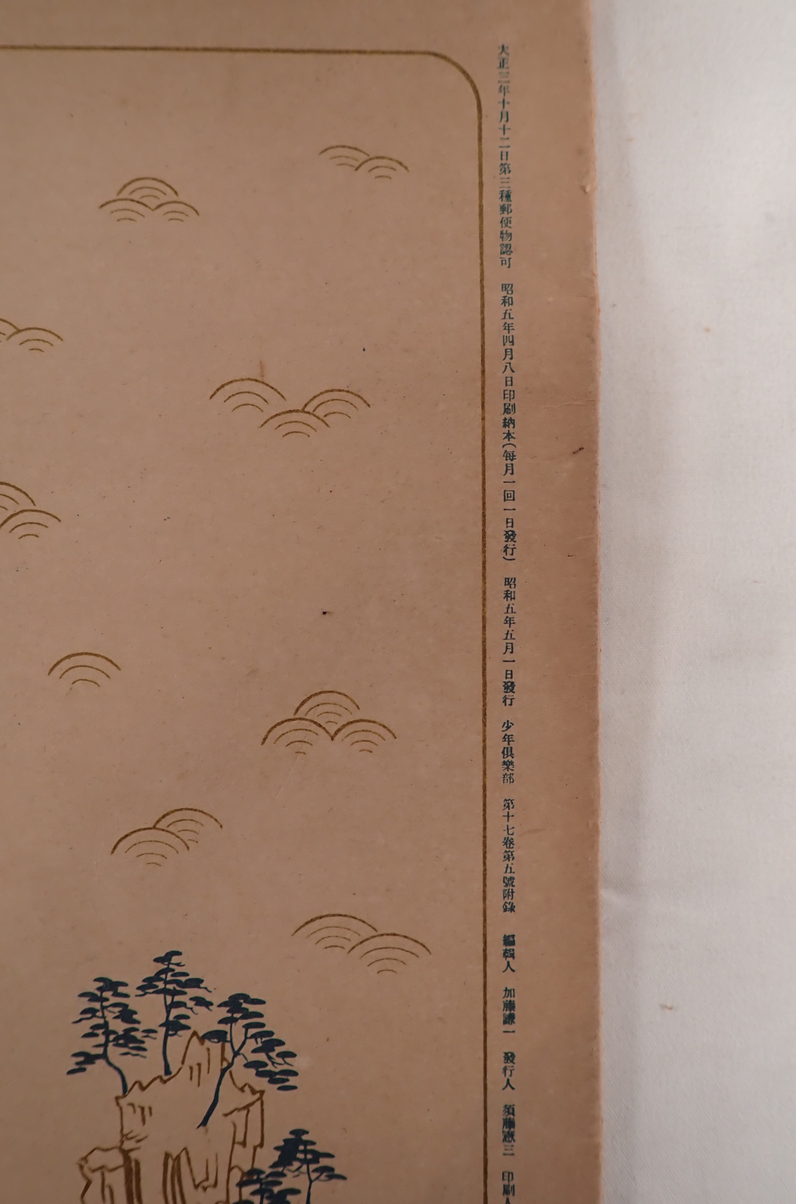 奥付には「昭和五年四月八日印刷/昭和五年五月一日發行」とあり、発行年代が明確な戦前資料です。装丁には鳳凰や雲文などの吉祥意匠が用いられ、昭和初期における皇室敬仰文化と児童雑誌史を伝える一品といえます。