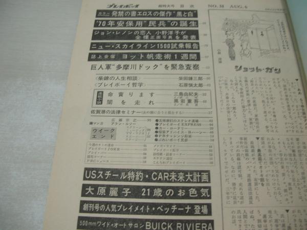 週刊プレイボーイ NO.31 1968年08月06日号 ビュイック・リビエラ 大原麗子・巻頭グラビア 渥美マリ ジョン・レノンの恋人小野洋子が全裸正面写真を発表(記事) スカイライン1500試乗報告(記事) グエンダ・ポールマン・巻中3折ピンナップ