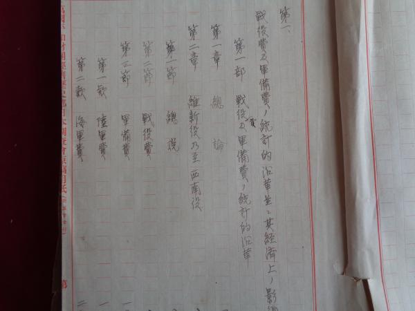 戦役費及軍備費ノ統計的沿革並二其経済上ニ及セル影響 稿本(調査員:大内兵衛、監修:小野義一、大正3年12月)万国平和財団経済歴史部日本調査会会長・男爵 阪谷芳郎に提出(大内兵衛執筆の原稿か?、万国平和財団経済歴史部日本調査会原稿用紙に万年筆で書かれたもので、500字詰150枚)