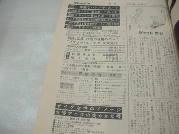 週刊プレイボーイ NO.22 1968年06月04日号 ダッジ・コロネット500 華麗なハレンチヌード/篠山紀信撮影 ミス・デンマーク来日 サイケな性衝動 アニタ・巻中3折ピンナップ  劇画:忍びの掟/京極仁 ※画像の様に裏表紙上部に破れ痛み出ています。