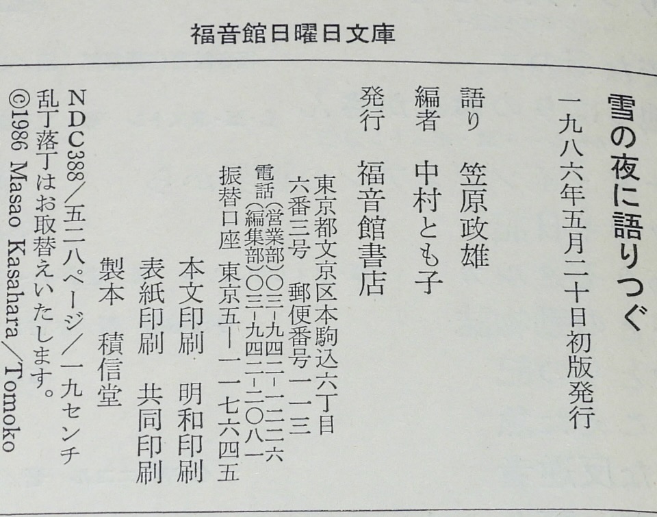 • 解説 雪の夜に語りつぐ ある語りじさの昔話と人生 福音館日曜日文庫 1986年5月初版 四六判箱帯付.