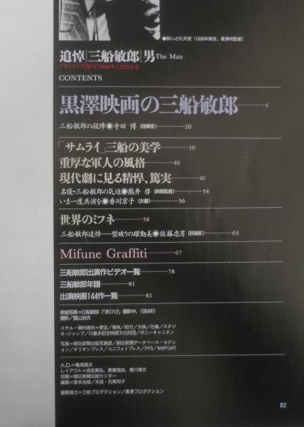 追悼/三船敏郎/男 黒澤映画の三船敏郎 「サムライ」三船の美学 重厚な軍人の風格 現代劇に観る精悍、篤実 いま一度共演を/香川京子 世界のミフネ 三船敏郎追悼・型破りの躍動美/佐藤忠男 Mifune Graffiti 三船敏郎出演作ビデオ一覧 三船敏郎年譜 出演映画144作一覧