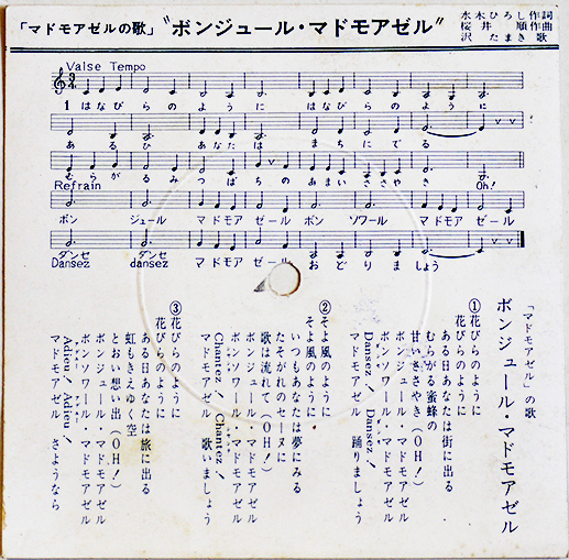 マドモアゼルの歌「ボンジュール・マドモアゼル」沢たまき歌 ソノシートサイズ14×14㎝ 小学館 1960年代