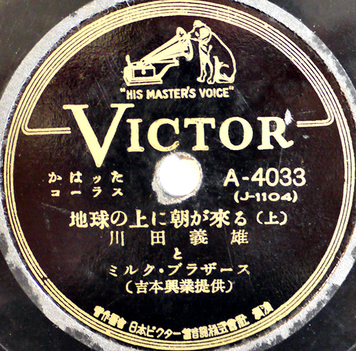 SPレコード 万歳「地球の上に朝が来る(上下)」川田義雄とミルク・ブラザーズ 盤面経年傷汚れ 日本ビクター 昭和20年代