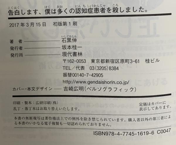 告白します、僕は多くの認知症患者を殺しました。 まちがいだらけの日本の認知症医療 現代書林 石黒 伸