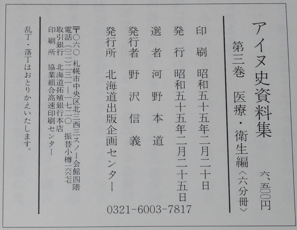 • 解説 アイヌ史資料集 第三巻 医療・衛生編 北海道出版企画センター 昭和55年2月発行 A5判箱入.