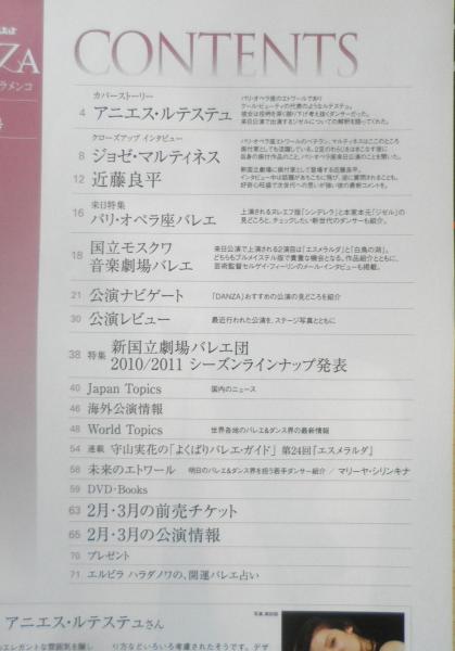 カバーストーリー/アニエス・ルテステュ クローズアップインタビュー/ジョゼ・マルティネス 近藤良平 来日特集/パリ・オペラ座バレエ 国立モスクワ音楽劇場バレエ 公演ナビゲート 公演レビュー 特集/新国立劇場バレエ団2010/2011シーズンラインナップ発表 他