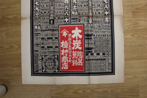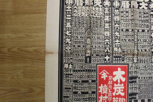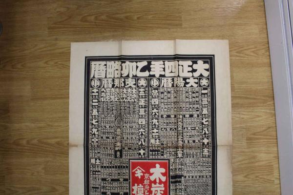5 5 引札 略暦 大正4年 木炭 陶器 荒物 京都府乙訓郡向日町 槙村商店 石版2色刷 約76.5×58.5㎝