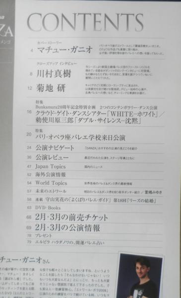 カバーストーリー/マチュー・ガニオ クローズアップインタビュー/川村真樹 菊地研 特集/クラウド・ゲイト・ダンスシアター「WHITE-ホワイト-」 勅使川原三郎「ダブル・サイレンス‐沈黙」 特集/パリ・オペラ座バレエ学校来日公演 公演ナビゲート 公演レビュー Japan Topics World Topics 海外公演情報 他