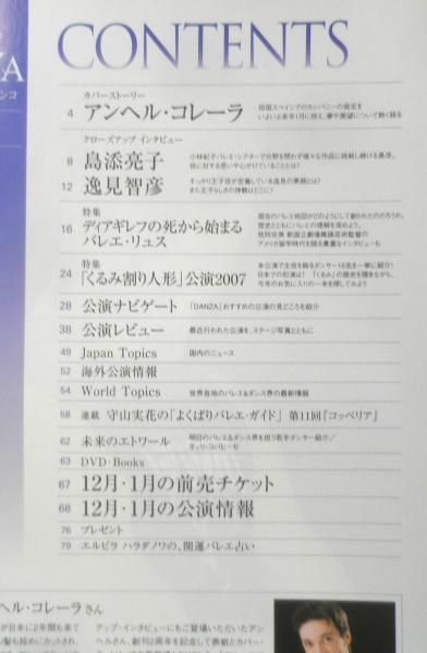 カバーストーリー/アンヘル・コレーラ クローズアップインタビュー/島添亮子 逸見智彦 特集/ディアギレフの死から始まるバレエ・リュス 特集/「くるみ割り人形」公演2007 未来のエトワール・明日のバレエ&ダンス界を担う若手ダンサー紹介/ネッリ・コバヒーゼ 公演ナビゲート 公演レビュー Japan Topics World Topics 海外公演情報 他