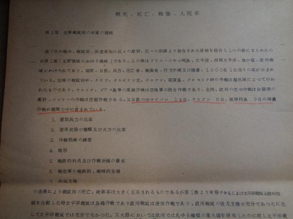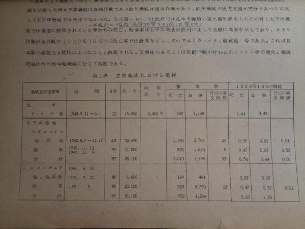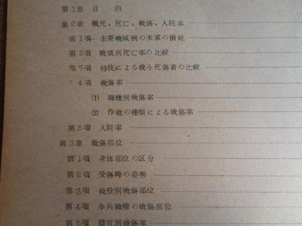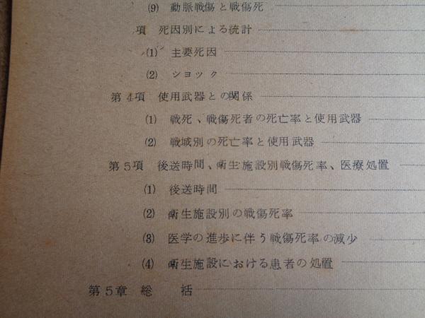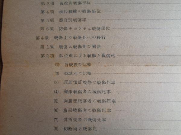 太平洋戦争及び朝鮮戦争における戦傷者の統計(陸上自衛隊衛生学校、発行年不明)戦死、死亡、戦傷、入院率、死亡別統計、使用武器との関係、医療措置ほか