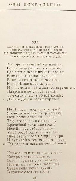 本書には、皇帝・女帝に捧げられた壮麗な頌詩 (オード) 群をはじめ、宗教的詩篇、英雄叙事詩『ピョートル大帝』、悲劇作品『タミラとセリム』『デモフォント』、さらにはロシア詩学の基礎文献として名高い理論書『ロシア詩法についての書簡』も収録。