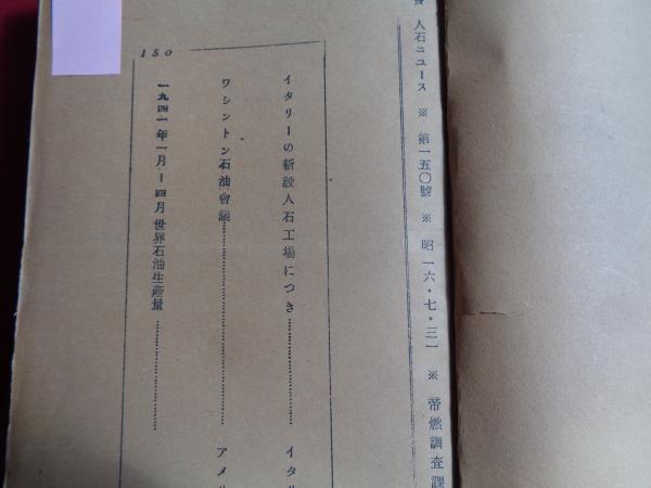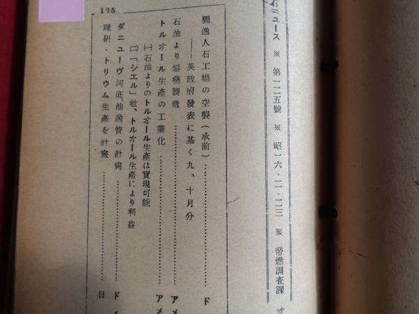 • 解説 内容:ワシントン石油会議、イタリー新設人石工場、米・戦争石油事情、石油と独逸の戦略、米合衆国の石油戦時体制、戦争とスエズ運河、近東の石油とイギリス、イタリアに人石工場新設、ソ連の石油、英国の対独封鎖、英帝国の石油生産、米国の航空機用ガソリン、石油価格新統制令、ドイツ人造石油工場調べ、日本の蘭印石油買付、石油代用品の世界生産学、獨逸液体燃料、スエーデン人造石油国策会社の設立、獨逸人口石油工場の空襲、トリオール・トリウム生産、ドイツ新人造石油会社設立、木炭瓦斯、戦時下に於けるタールほか(殆どが当事国ほか文献・論文などの翻訳資料)表紙のに記された号数には若干の誤りが見られるためチェックしてあります。