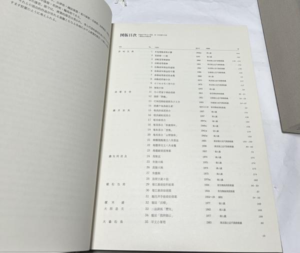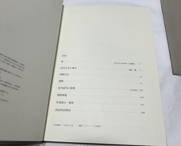 • 解説 クロス箱付(日焼け、色落ちあり)付 本体背少ヤケ以外は状態良い方 292頁 カラー163図版 赤地友哉、赤塚自徳、磯井如真、磯谷阿伎良、植松包美、大場松魚、音丸耕堂、黒田辰秋、白山松哉、高野松山、田口善国、松田権六、山永光甫等 27x36cm 定価35.000円 昭和56年刊 ISBN:4473007383