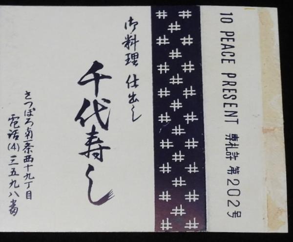 「御料理 仕出し 千代寿司/千代寿司に会する我もその一人 虚子/専札許第202号」