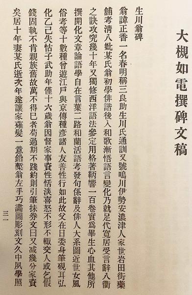 さらに学者・大槻如電 撰「生川翁碑」稿を併載し、近代国学界との関係をうかがわせる点でも注目。