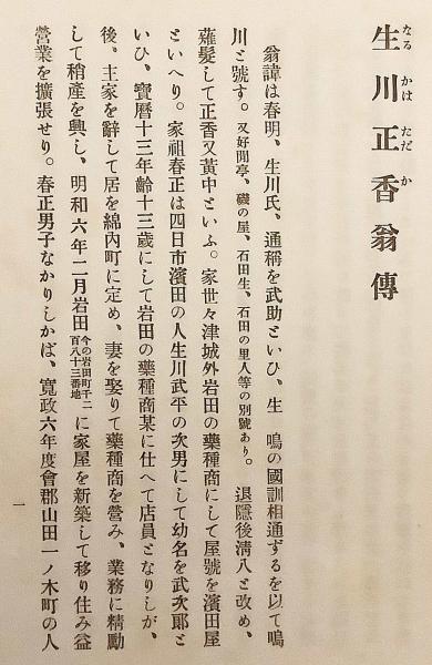 伊勢国四日市浜田の薬種商に生まれ、江戸後期から明治にかけて活躍した国学者・生川春明 (号:正香) の生涯を伝える顕彰記念出版。