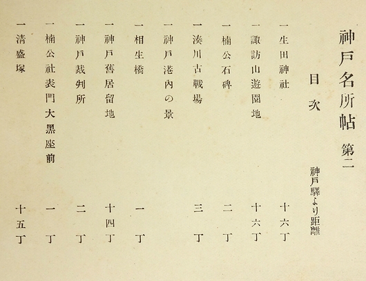 生田神社、諏訪山遊園地、楠公石碑、湊川古戦場、神戸港内の景、相生橋、神戸旧居留地、神戸裁判所、楠公社表門大黒座前、清盛塚