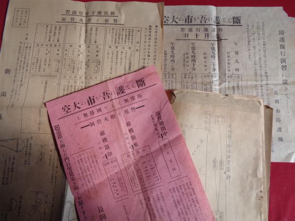 • 解説 田尻村防護団則、防空演習に関し市民各位へ(長岡市防護団)新潟県下防空演習・警報と燈火管制(新潟県2枚)断じて護れ吾が市の大空(長岡市防護団、2枚)、新潟県下防空演習図解、燈火管制及び警報伝達実施区域・同実施計画概要、警報伝達系統図、同伝達方法、燈火管制実施要領、特殊灯台の管制法、警護班服務要領ほか