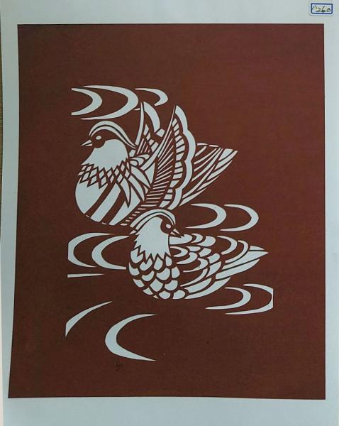 • 解説 D26020260〇伊勢型紙 手彫り オシドリ夫婦 鴛鴦 アート 伝統和紙工芸 貼り絵 切り絵 昭和レトロ インテリア〇和本古書古文書